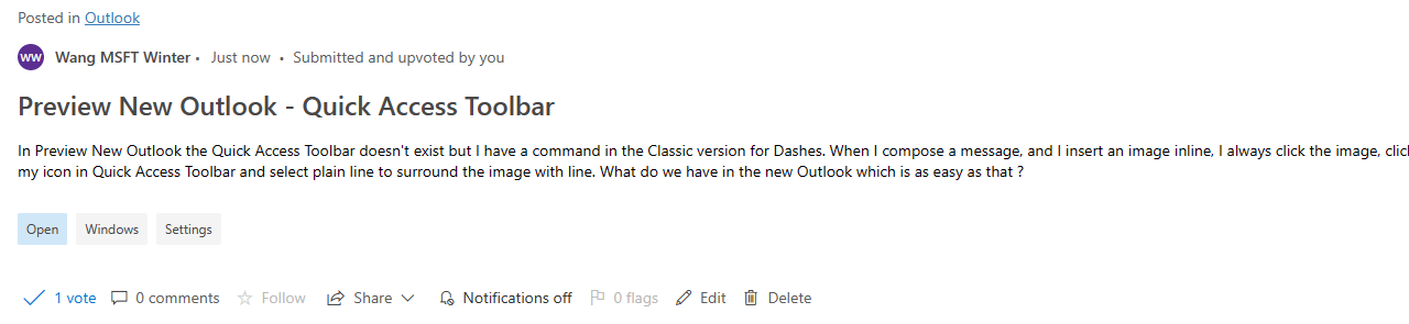 In Preview New Outlook the Quick Access Toolbar doesn't exist but I have a command in the Classic version for Dashes. When I compose a message, and I insert an image inline, I always click the image, click my icon in Quick Access Toolbar and select plain line to surround the image with line. What do we have in the new Outlook which is as easy as that ?