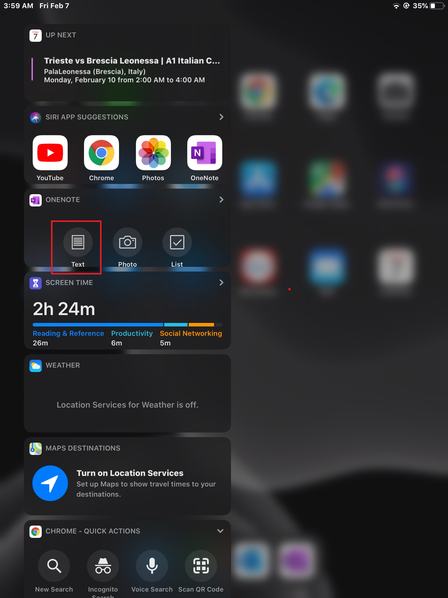 A OneNote widget is available in OneNote for Android devices, since they have a Home Screen. However, in iPhone or iPad, home screen widget is currently unavailable, since iPhone and iPad doesn't have a Home Screen.