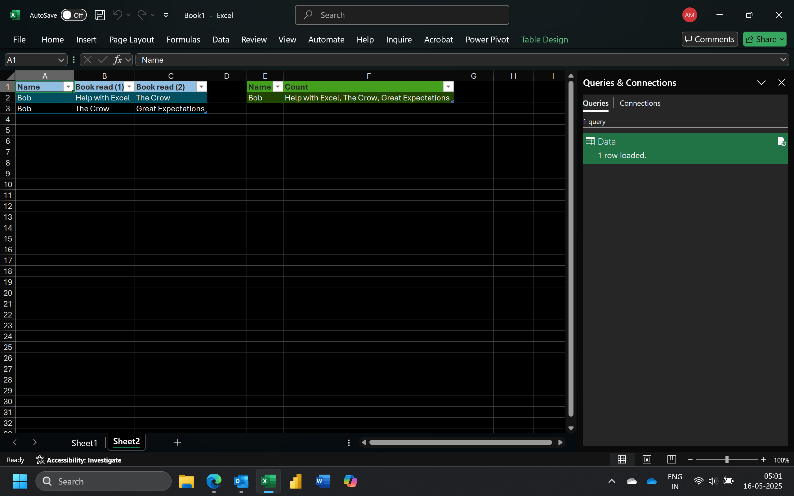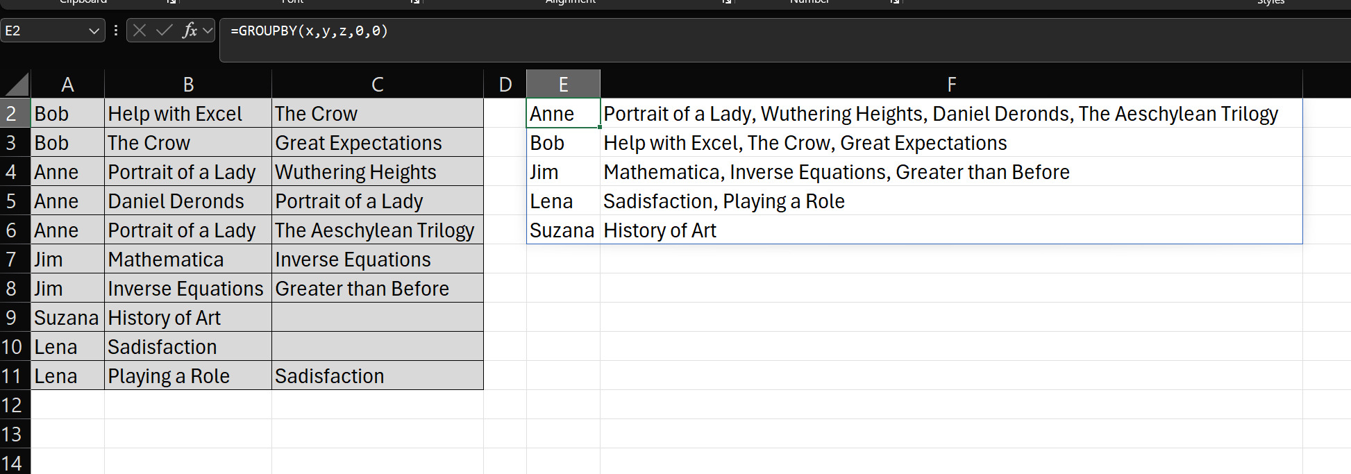 | Bob | Help with Excel;The Crow;Great Expectations |