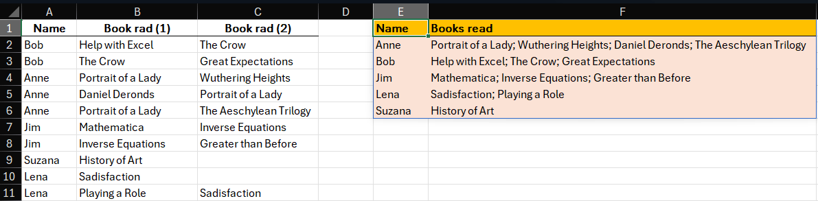 =LET(tr, TRIMRANGE(A2:C20), unq, UNIQUE(HSTACK(TRIM(TEXTSPLIT(ARRAYTOTEXT(REPT(UNIQUE(SORT(TAKE(tr,, 1))) & ",", BYROW(DROP(GROUPBY(TAKE(tr,, 1), DROP(tr,, 1), COUNTA,, 0),, 1), SUM))),, ",", TRUE)), TEXTSPLIT(ARRAYTOTEXT(BYROW(DROP(SORT(tr),, 1), ARRAYTOTEXT)),, ", "))), IFERROR(VSTACK({"Name","Books read"}, GROUPBY(TAKE(unq,, 1), TAKE(unq,, -1), LAMBDA(a, TEXTJOIN("; ",, a)),, 0)), ""))
