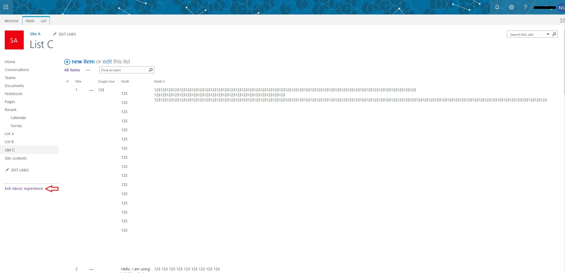 2. Classic List - My list looks like it's a Classic version BUT it does not have an 'Exit Classic experience' option. Will it be because of my site settings? Is there any other way to find whether it's a classic or modern list?