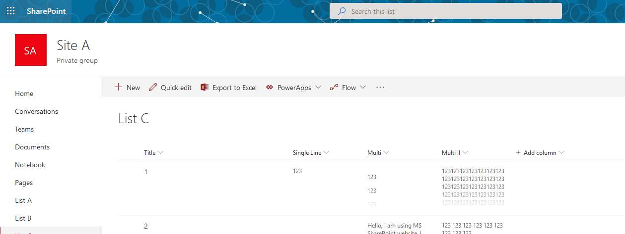 Hello, I am using MS SharePoint website. I created a column of 'multiple line of text'. I want to wrap the text for this column so that I can constrain the size of that column.