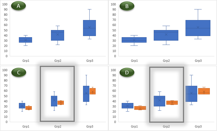 You need to set your data in one single column, with an additional column for the group labels so excel can distinguish between groups and create separate boxes.