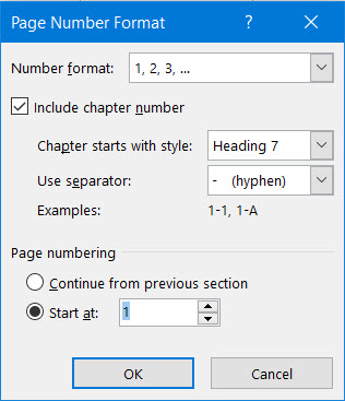 Using the above example where the Heading 7 style is used for the Appendix A, B, C, etc. in the Format Page Number dialog for the Sections of the Document containing the Appendices, in the Page Number Format dialog, you would check the box for Include chapter number and then select Heading 7 as the style that is used to start the chapter.