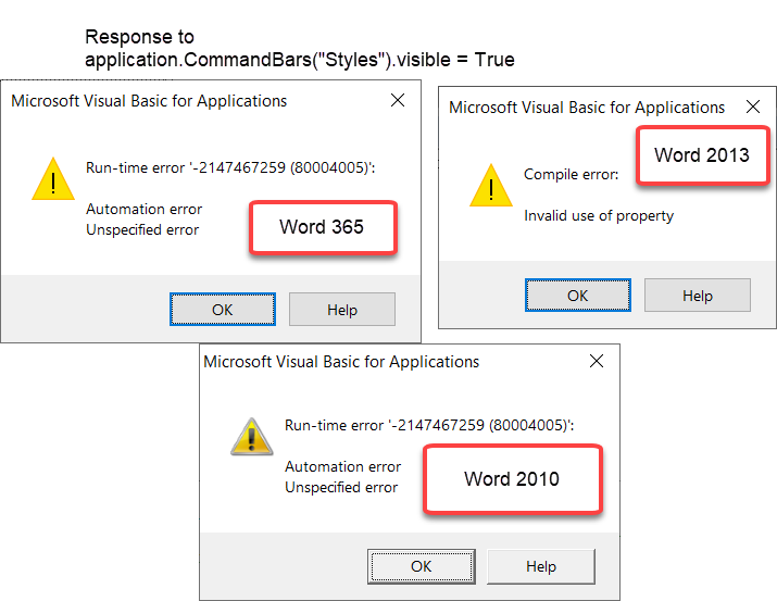 The following command in the immediate window results in an error. According to the documentation, it should simply make the Styles Pane visible.