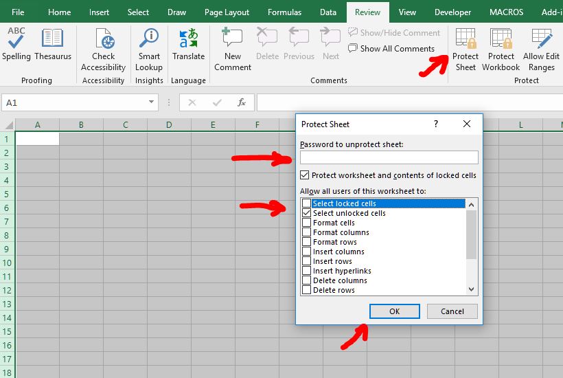 3 - Go to Review > Protect Sheet > Select unlocked cells only
