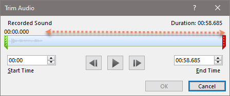 Look at the sound in the Trim editor, the area with the arrow is just silence for nearly a minute. Use the trim tool to remove the blank section and it should work (I did a couple of slides to confirm)