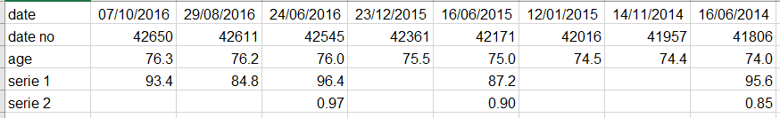 I would need to find a mean for Excel to add the "age" row as and additional horizontal axis. For example, in my original plot, I would need Excel putting a 73.4 tick mark on the additional horizontal axis in correspondence of 41600 (or 22.11.2013). 73.4 is, in years, the age of an individual, born on 20/07/1940 (14812), at the date of 22.11.2013, i.e. (41600-14812)/365. And similarly for the following dates.