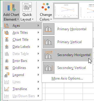 HansV 462.4K Reputation points MVP Volunteer Moderator2019-09-03T14:35:23+00:00 Step 1: after specifiying that serie 2 is plotted on the secondary (y-)axis, click Add Chart Element > Axes >Secondary Horizontal on the Design tab of the Ribbon (under Chart Tools). This option doesn't become available until a series has been plotted on the secondary (y-)axis.