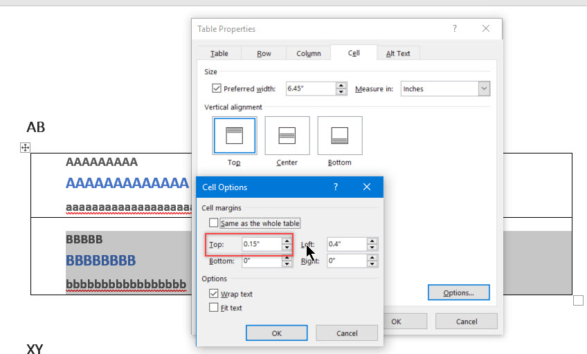 The cell in the second row of Table AB has the Top Margin set at 0.15”