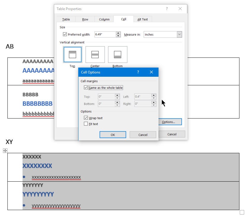 The cell in the first row of Table AB has the Top Margin setting as defined for the whole table, which is 0”