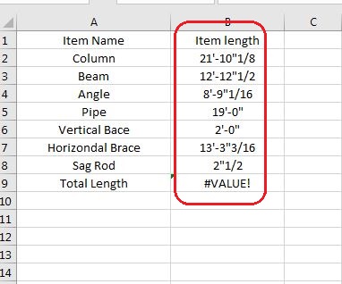 Two Visual Basic for Applications User Defined Functions, one to convert from decimal inches to feet, inches and fractions. The second function converts from feet and inches to decimal inches.