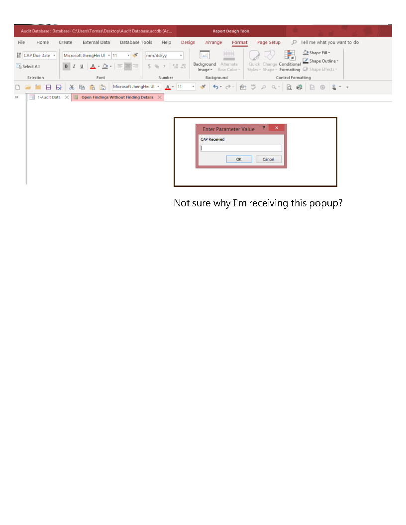 As regards the parameter prompt, it suggests that there is not a control named CAP received in the form.