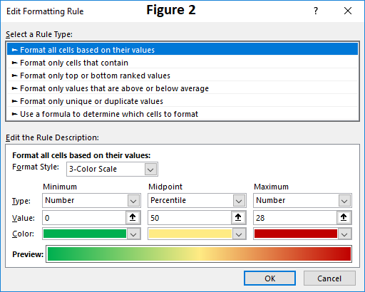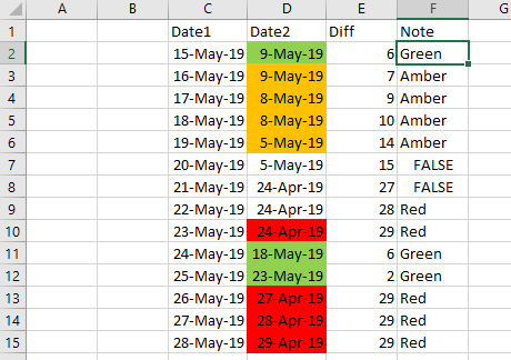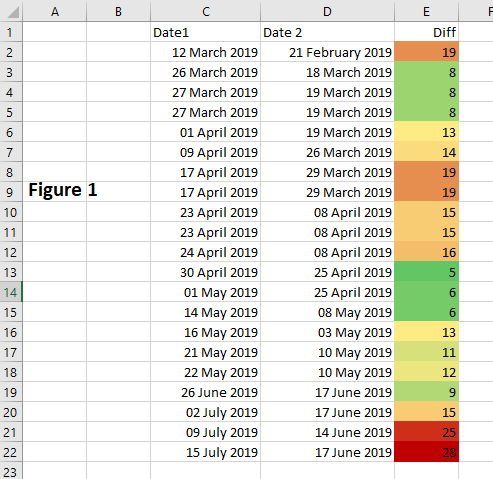 I am using Office 365. I have a set of dates in one column, say C and another set of dates in D. The dates in D are always lower (earlier) than the corresponding dates in C. I want to apply three-color grading to dates in D based on the difference between