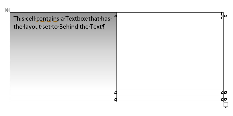 We are trying to fill a word table cell with Gradient or texture but unable to find the functionality to fill it with gradient or texture options. When I try to fill an object it is working fine but I want to fill a table cell. Is it possible? If so, Please do let me know how can we do that.