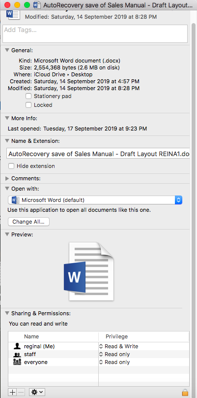 When you right click on the file then choose "get info" could you take a screenshot of that screen and send it here?