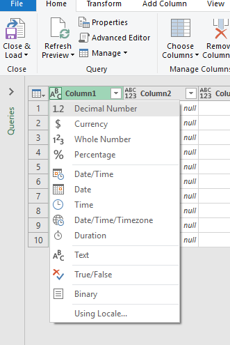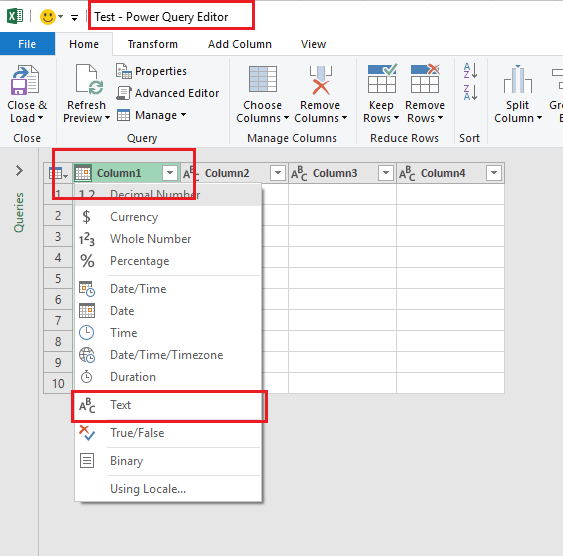 - In the new Query Editor window choose the column which you want to keep the Text formatting. (Like Column1 )