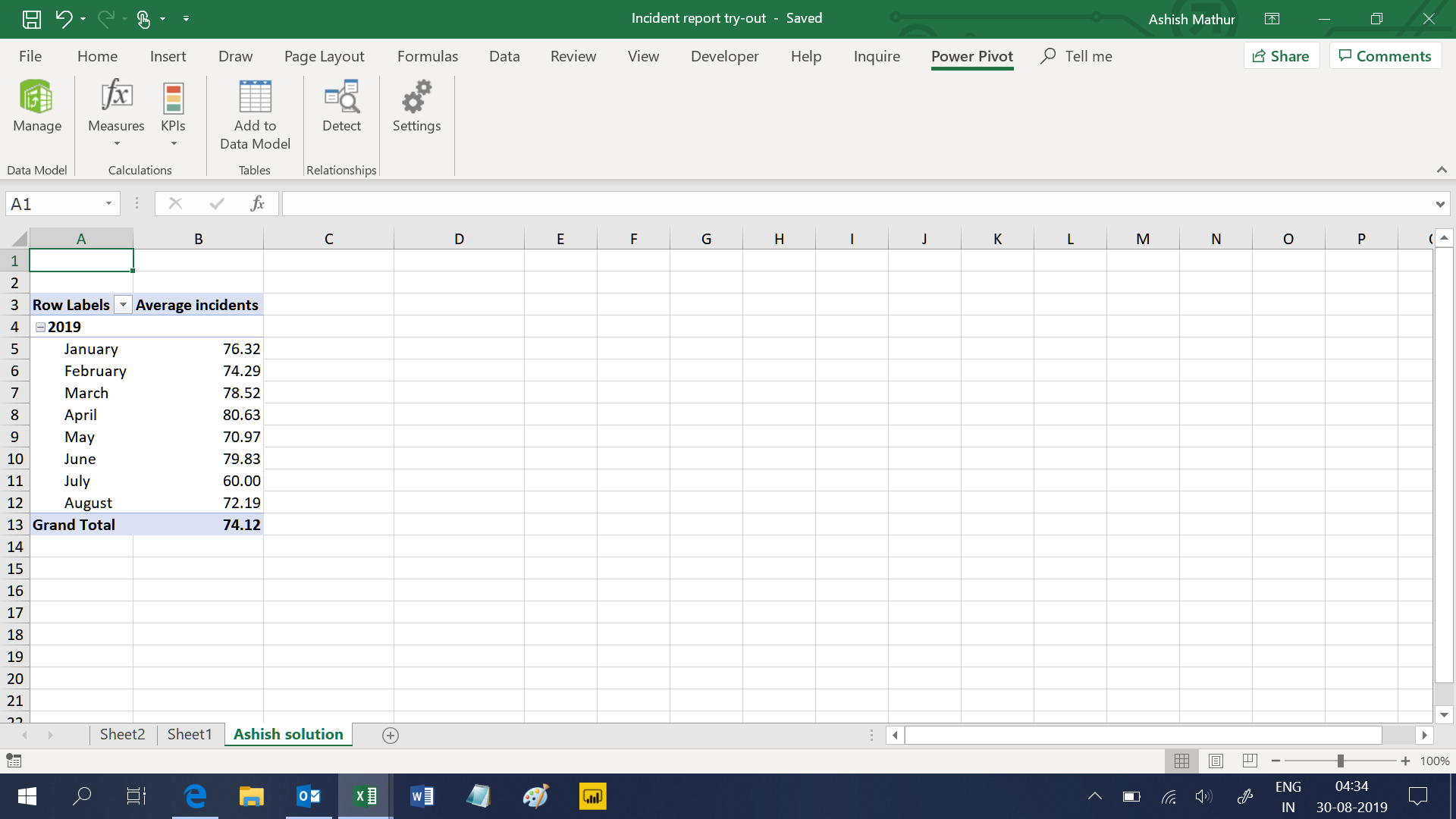 I have a report with many incidents with date and time in there. With a pivot table I found that I can count the incidents (input is incidentnumber) per day or per month, but I want the average amount of incidents per day, could you help me with this?