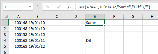Please try this formula in cell R4 =IF(AND(B4>1,J4<>J3),"DIFFERENT","SAME")