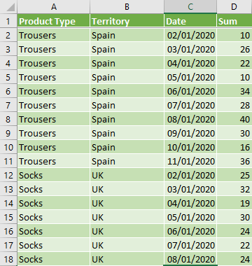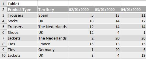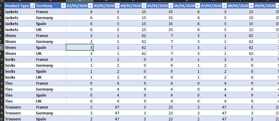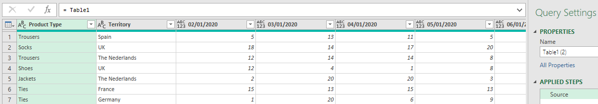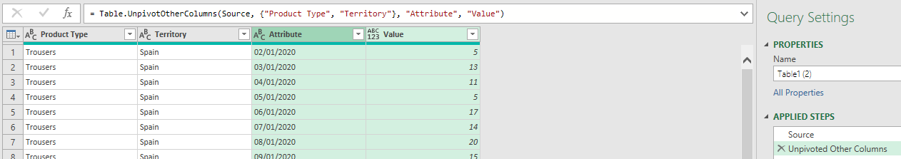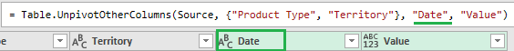 #2 Select columns [Product Type] and [Territory] > Go to Transform tab > click the little arrow down icon next to Unpivot Columns > choose Unpivot Other Columns. You should get: