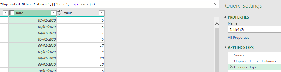 you see that by default unpivoted columns are named [Attribute] and [Value]. That's where I "cleverly" made a modif. At the end we want a [Date] column. So we could continue the default [Attribute] column name but then we would need an additional Step at the end to rename that column => [Date]. To prevent this, just edit the Step in the formula bar and change the string "Attribute" with… "Date" :