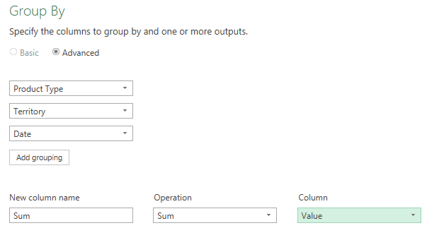 #4 Select columns [Product Type], [Territory] and [Date] > Right-click > Group By… use the following: