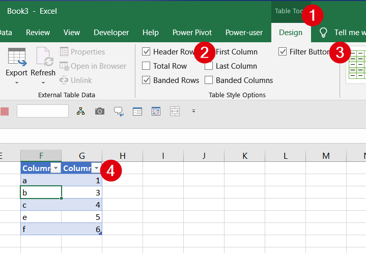 - in the Table Tools contextual > Designs tab > Table Style Options: