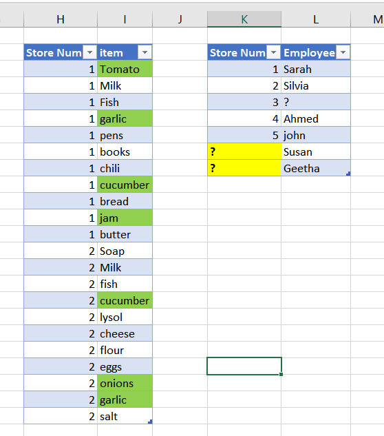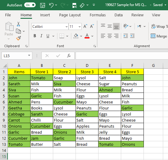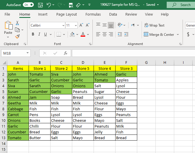 How are the first 4 "items" in the "items" column, items, they are people's names? Are you selling people (that is frowned on in some places <g>). And the entries in the first row under the various stores are all in the first column, but for the other rows they have some new "items".