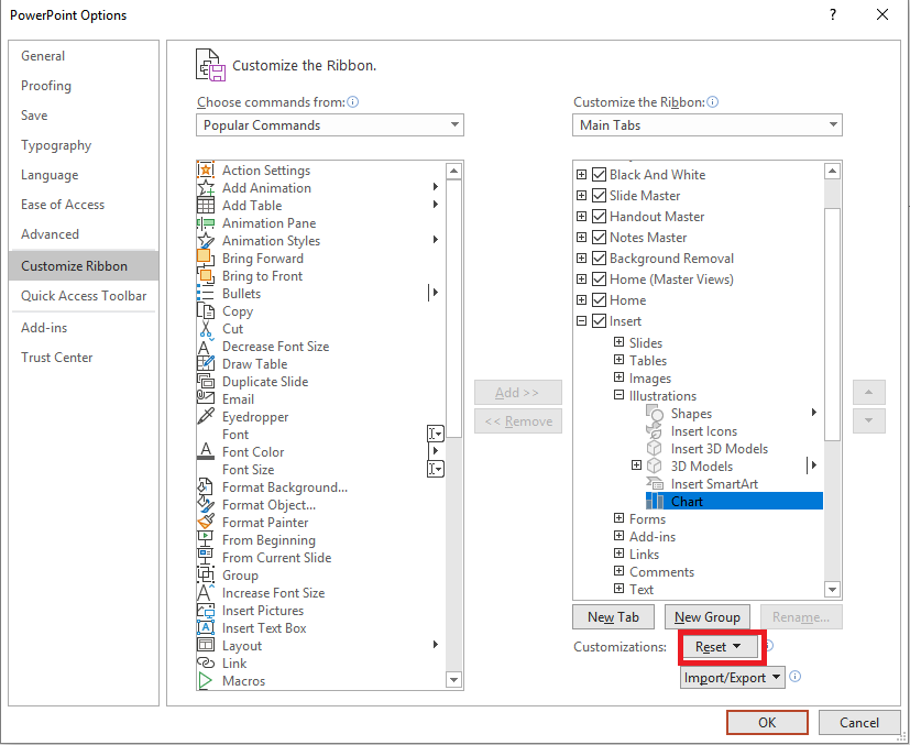 If you are using desktop version of PowerPoint, please go to File>Options>Customize Robbin to **** check there is a Chart command under Illustrations group. If there is no **Chart,**please click Reset that is circled in the screenshot.