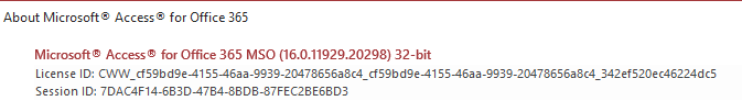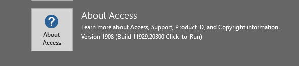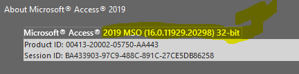 George Hepworth 22,220 Reputation points Volunteer Moderator2019-09-26T14:32:46+00:00 You can find the version of Access installed on your computer by clicking on File--> Account-->About Access.