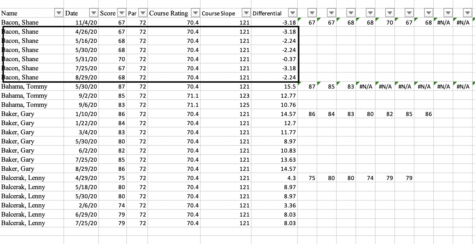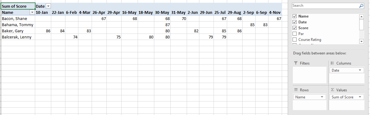 Do the scores relate to more than one golf course? It looks like Tommy Bahama may have played a couple of different coursed (based on "slope", what ever that is). You could add the course names to the pivottable.