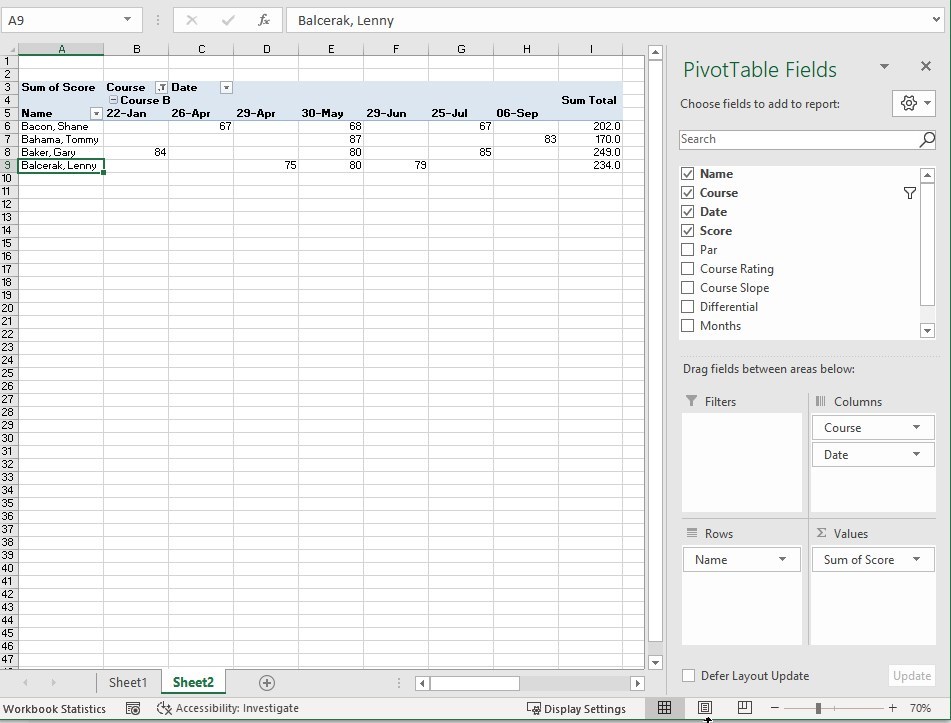 PivotTables are a good way to go. While this is the end of the golf season, if you are going to be doing this again next year, a PivotTable is definitely the best way to go.