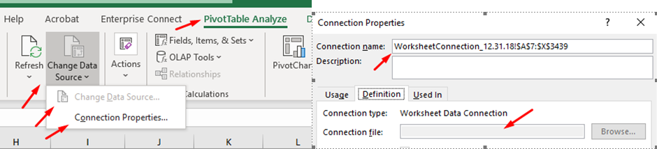 Generally, the Connection Properties option is available when you use external data sources such as network sources or other local files' sources to create the pivot table. So I'd like to confirm whether the pivot table is created from external data sources. If yes, what external data sources are you using?