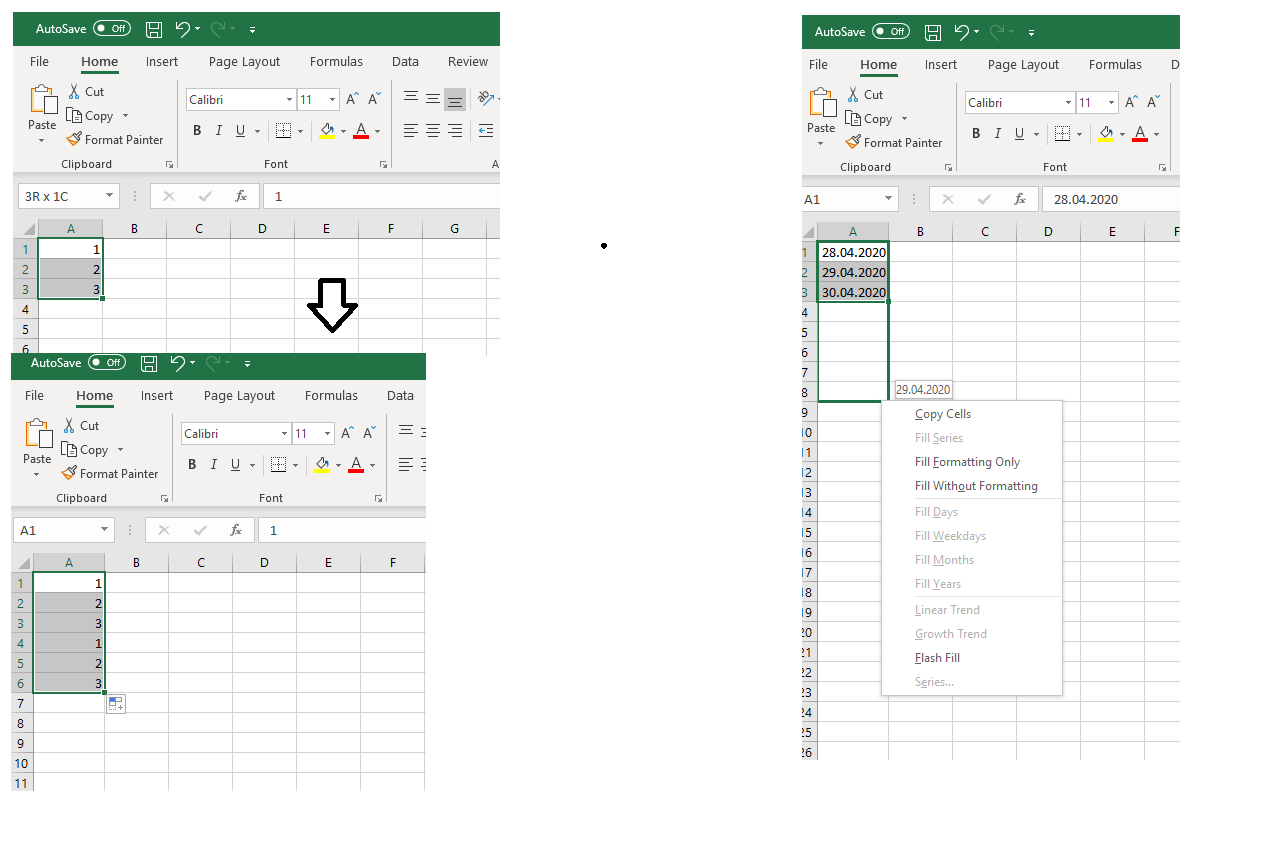 Maybe this picture can help: I tried to autfill the sequence from 1 to 10 starting with 3 cells on the left side. On the right side I tried to autofill the dates (already formatted in short form) while holding right-click to get into the autofill "menu". You can see what I tried to describe in post above. I can't choose how to increment steps in the sequence.