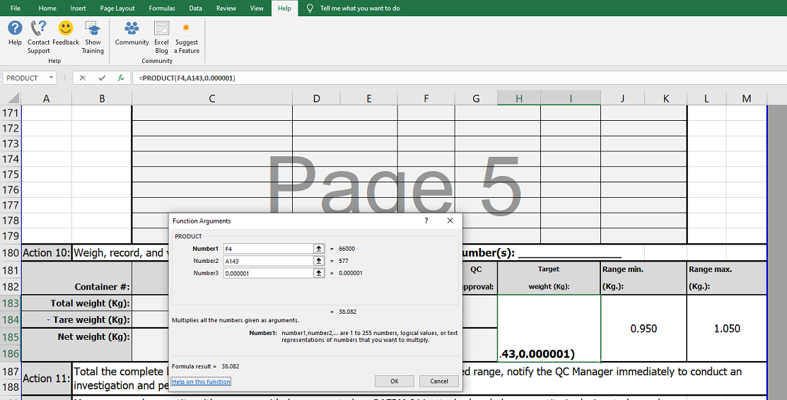 You could try removing each of the 3 arguments in turn to see if the formula resolves correctly. that is, if product(f4, A143) returns the correct amount, then you at least know the the formula has an issue with the 3rd argument. Once you know the one