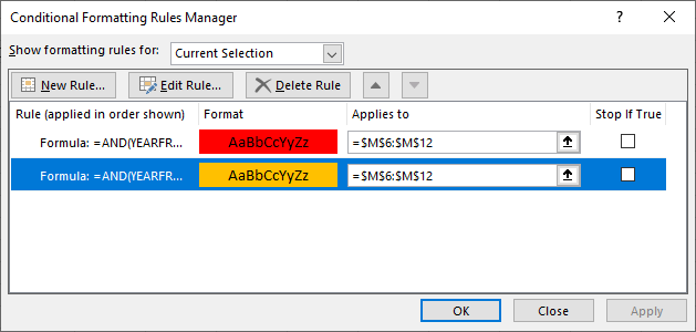 The order is important because if you had the amber one above the red one, because the condition is anything over 30 moths would also be true for dates over 35 moths....so the red rule would never be used. Changing the order is done with the up and down arrows next to the delete rule. My rules only work on M6 to M12, obviously you'd have to change that.