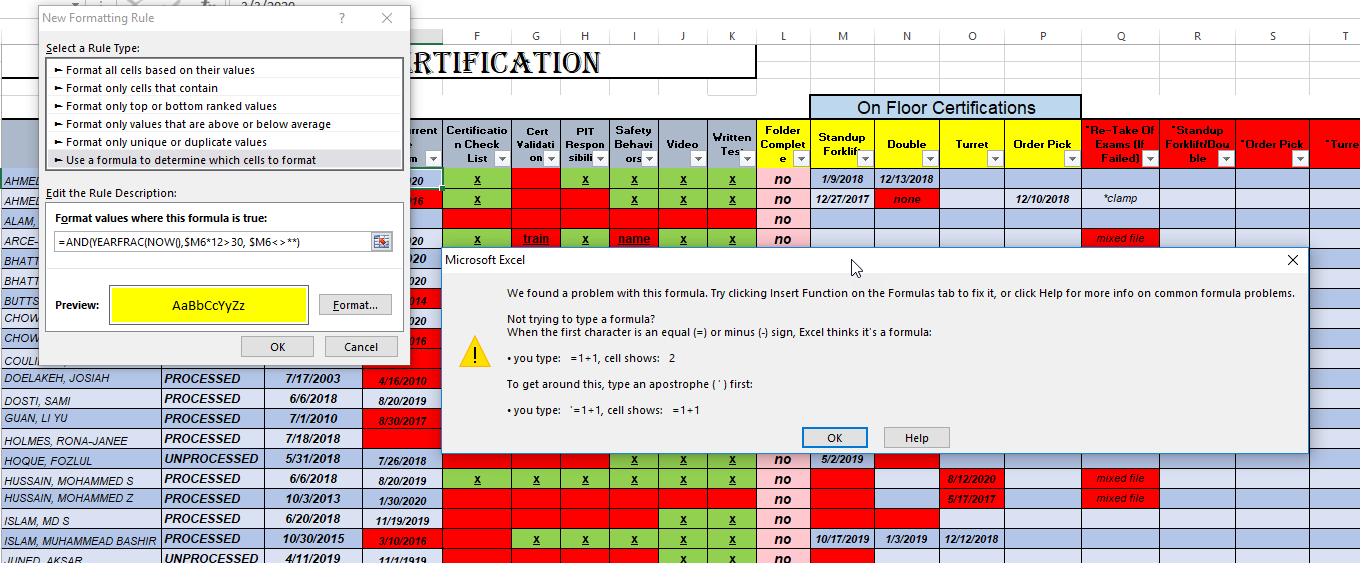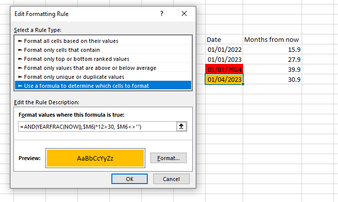The formula above uses now() which is a volatile function, that is, it refreshes when the sheet does, so you might want to link this to a specific cell in your worksheet. This will give you the total months between now and the date in the cell. You want anything over 2 years 6 months (30 months) to be yellow and anything over 2 years 11 months (35 months) to be red.