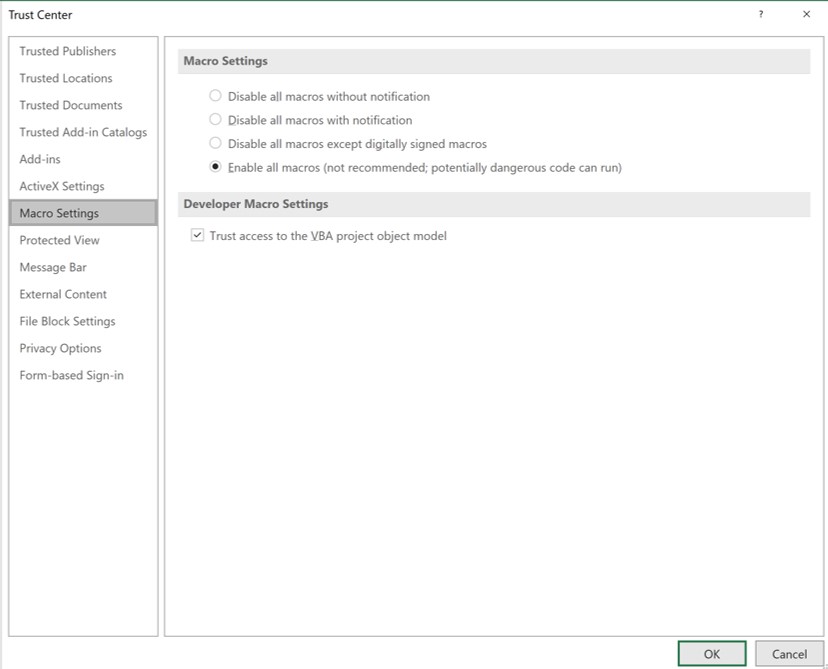 Second, you do NOT want to enable access to the vba project object model unless you have some other reason to do so.