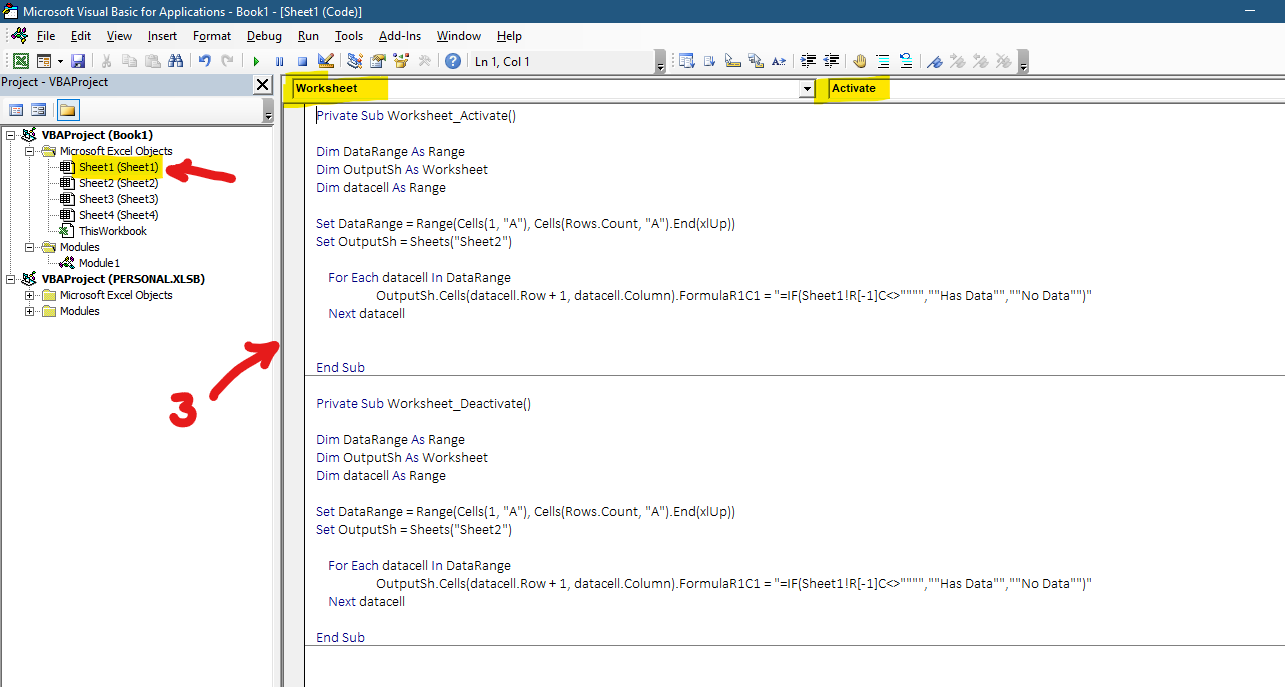 The following codes will run each time Sheet1 is activated (selected) or deactivated