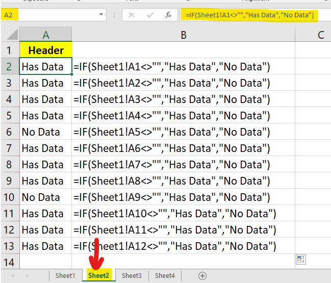 ws2.Range("A2:A10").Formula = "=IF(Sheet1A1>"""", ""Has Data"",""No Data"")"