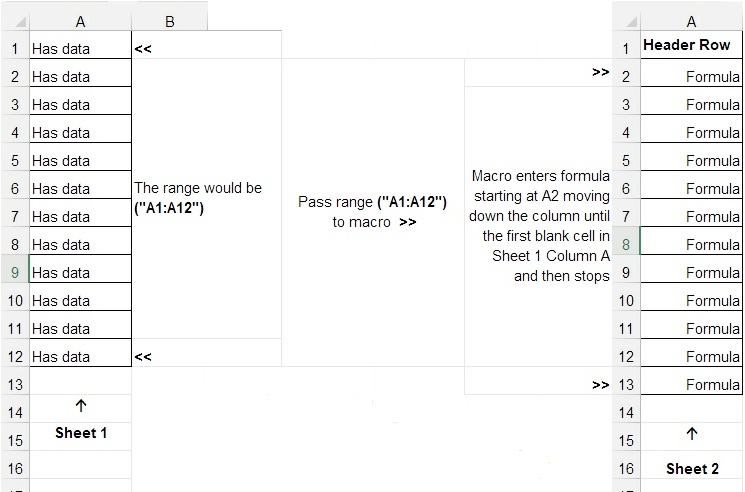How I would like it to work is the macro finds the first and last cells with data in “Sheet 1” Column A and use that to specify the range on “Sheet 2” Column A into which to enter the formula copied down the number of rows identified by the range from “Sheet_1”.