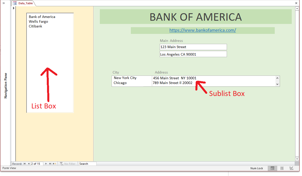 Hi Steve, I'm a bit confused by what you have there. You appear to have 15 records so the form is obviously bound to a table. When you click on the main list box it changes the bank name, address and sub list box of branches. It doesn't make sense (to me)