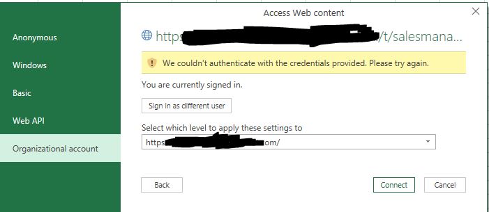I'm trying to connect to an Excel workbook within my SharePoint Online library, which I can access via my normal credentials and can sign on to my account via non-browser when I go to File -> Account.