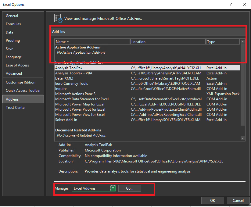To figure out whether it is truly related by add ins in Excel application, you can go to File> Options> Add-ins> Go to uncheck all the active add-ins in Excel application with Safe Mode
