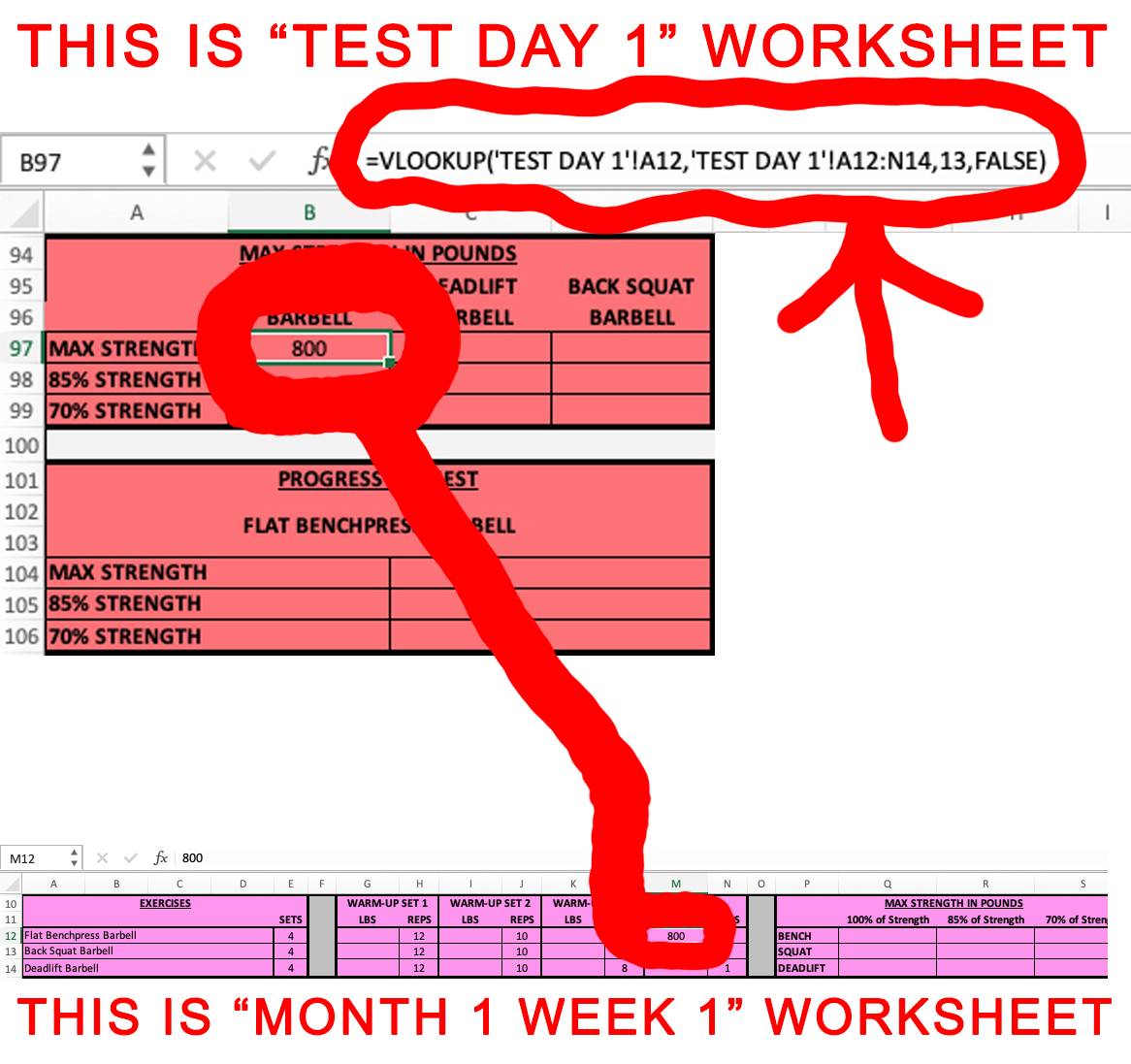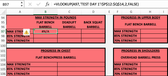 I'm confused by your first formula which is =VLOOKUP(A97,'TEST DAY 1' !$P$12:$Q$14,2,FALSE)