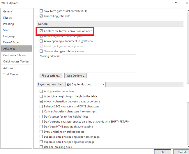 I want to open a Microsoft word document with UTF-8 encoding. For that, I have checked the item "Confirm file format on open" in Options --> Advanced --> General. I expect then that a window pops up when I open the document to let me choose an encoding for that document. But such a window doesn't show up and the document opens as before!