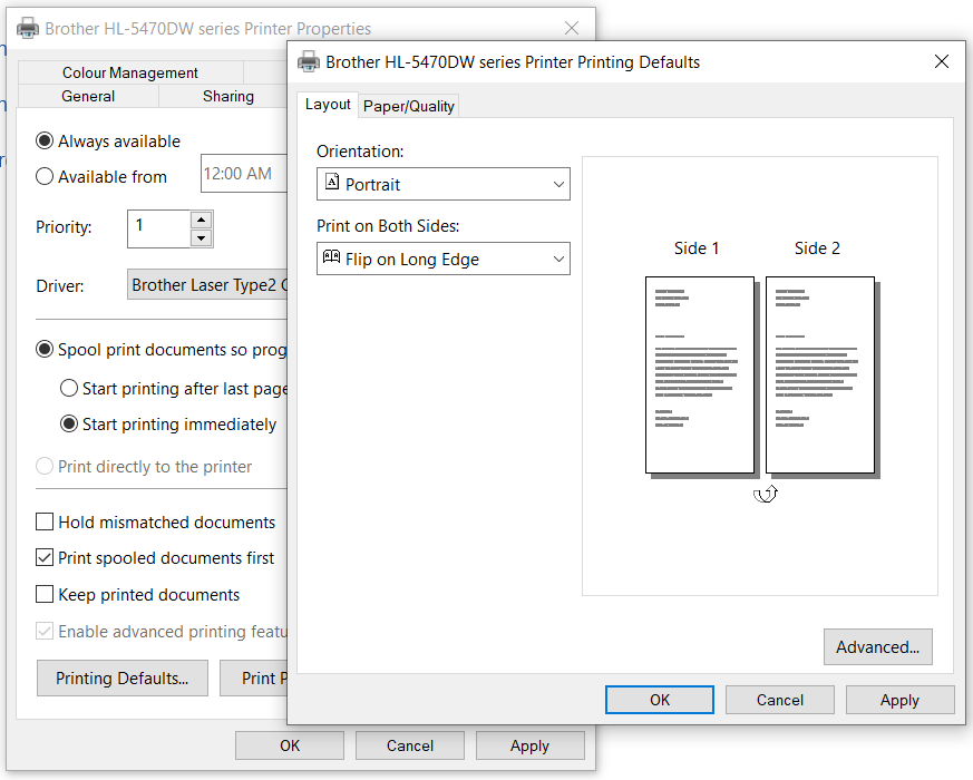 For duplexing, you will need to set this as the default through Windows Settings | Devices | Printers and Scanners. Select your printer and click on Manage. On the Manage your device page, click on Printer properties, and then choose the desired settings in the Properties dialog for your printer.