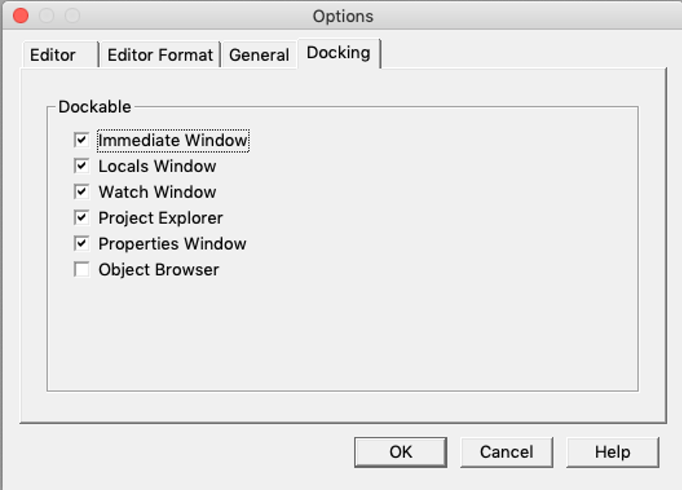 I am having problem locking windows such as the Immediate and Watch windows in Excel Mac. The windows originally were attached to the bottom of the grey work area in the VB window along with the code windows. I could resize, and enlarge/reduce them but they stayed at the bottom. I appear to have done something and now the windows either float independently of the VB window or they will only lock at the top.