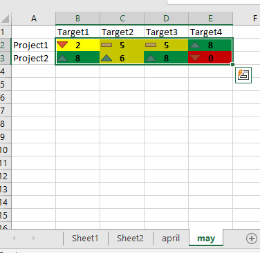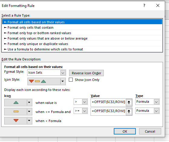 As per your description, it seems you want Conditional Formatting with Icon Sets using relative reference. Create a conditional formatting in a column that will look to the value in the previous month column e.g. if value higher than reference value then green, if equals then orange, otherwise red. You can use OFFSET formula e.g. in the conditional formatting, using the formula "=OFFSET($C$3,ROW()-3,0,1,1)" for the "green".