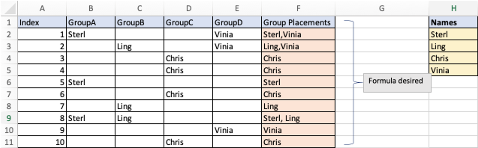 Example - Which formula can assist with placing Sterl(Col2) and Vinia(Col5) into Group Placements column(6).